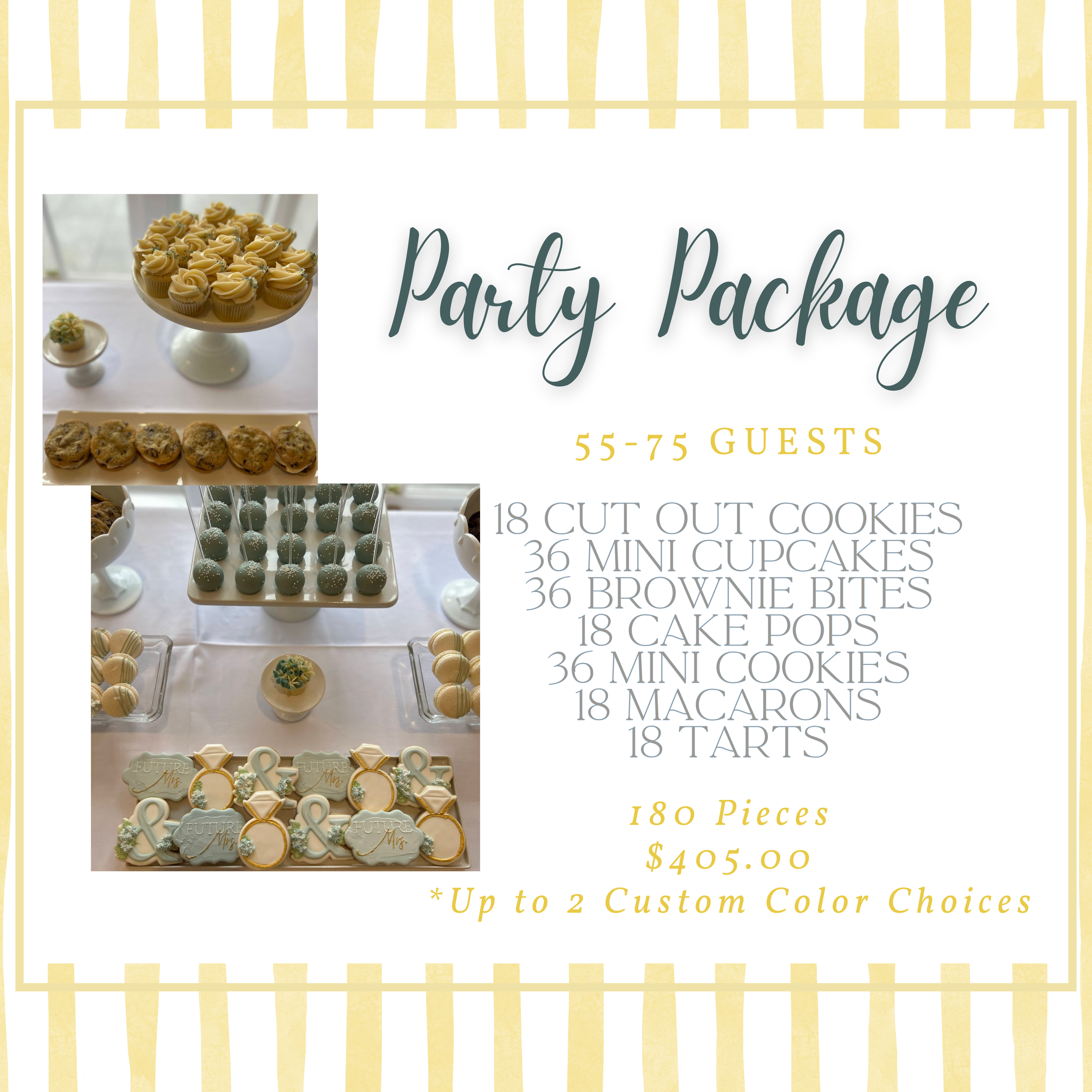 Our dessert table displays are a show stopping, unique and of course delicious way to wow your guests no matter the occasion! Why choose just one dessert when you can have a variety? Choose from one of our pre-built dessert table options to fit your event and budget, or we can work with you to create a custom dessert display specific to your event theme, colors and taste preferences!